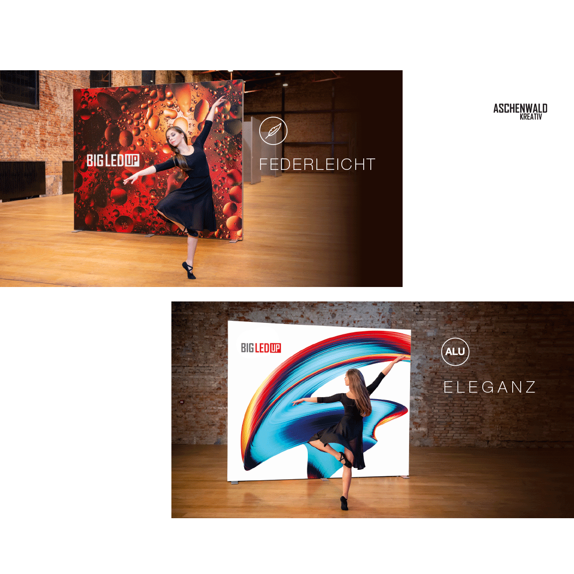 Die Innenkonstruktion besticht durch hochwertig verarbeitete Aluminium-Elemente. Ein intuitives Farbleitsystem vermittelt, was zusammengehört. Dank des weltweit patentierten LEDUP Stecksystems gleiten die sorgfältig geglätteten Aluminiumprofile mühelos ineinander und verbinden sich zu einem eleganten und hochstabilen Leuchtrahmen. Zwei einfach von der Hand anzubringende Schrauben verbinden den Rahmen mit den soliden Füßen. Rundumlaufend vernähte Silikonkeder sorgen für faltenfreie Spannung der Sujets.