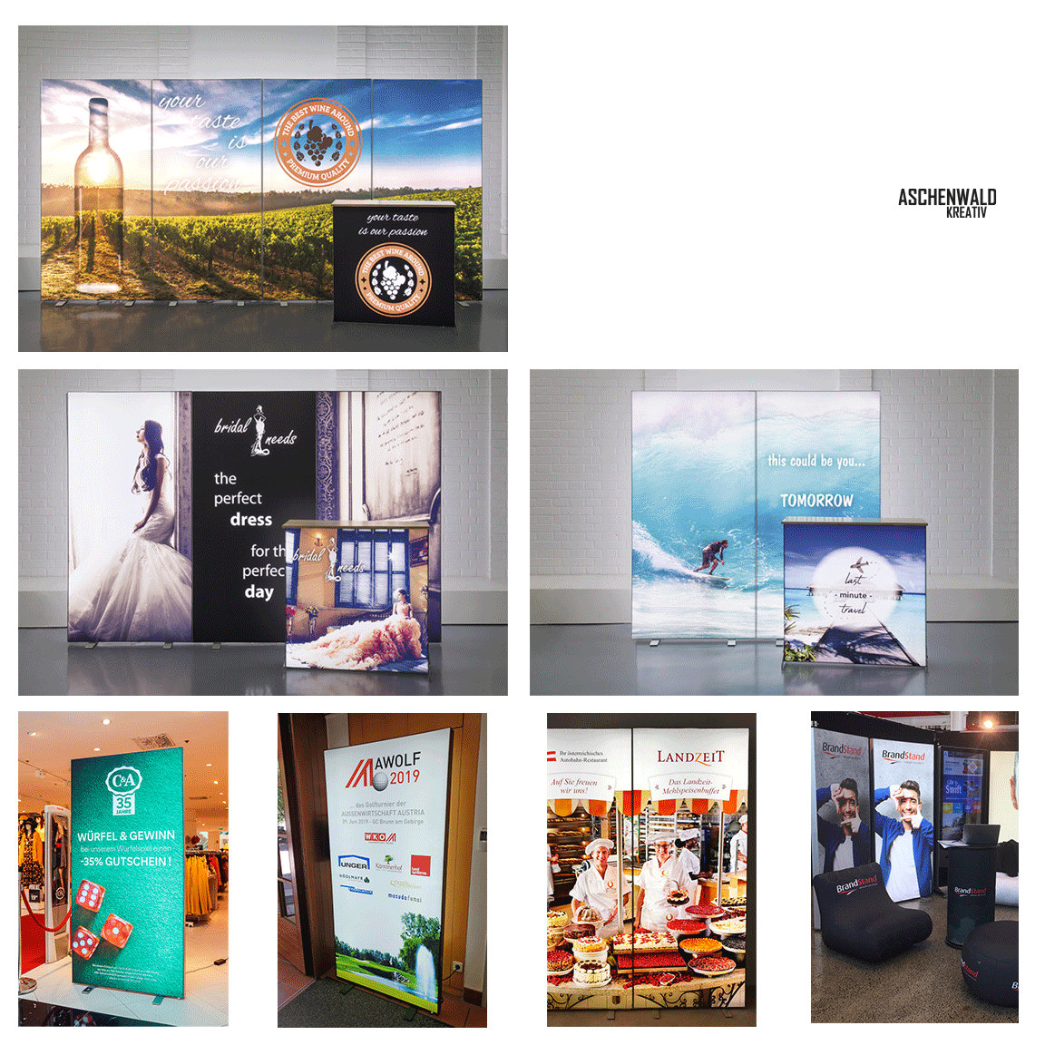 Mit nur ein paar Handgriffen sichern Sie sich einen eindrucksvollen Auftritt. Jedes Display kommt in einer patentierten Transportbox, in der sich auch die zugehörigen Digitaldrucke platzsparend verstauen lassen.
