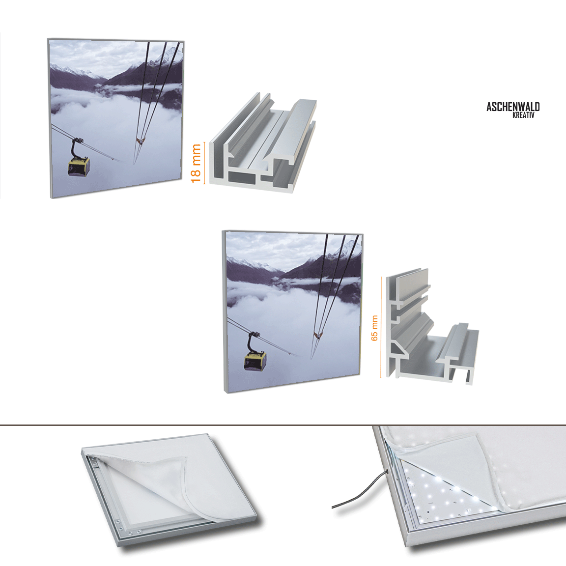 Das System multi frame besteht aus Rahmenprofilen mit unterschiedlicher Bautiefen (18, 65 mm & multi tower 3D) aus silber eloxiertem Aluminium. Sie dienen zur Aufnahme von unterschiedlichen Druckmaterialien (Stoff), welche mit Gummilippe konfektioniert werden können.